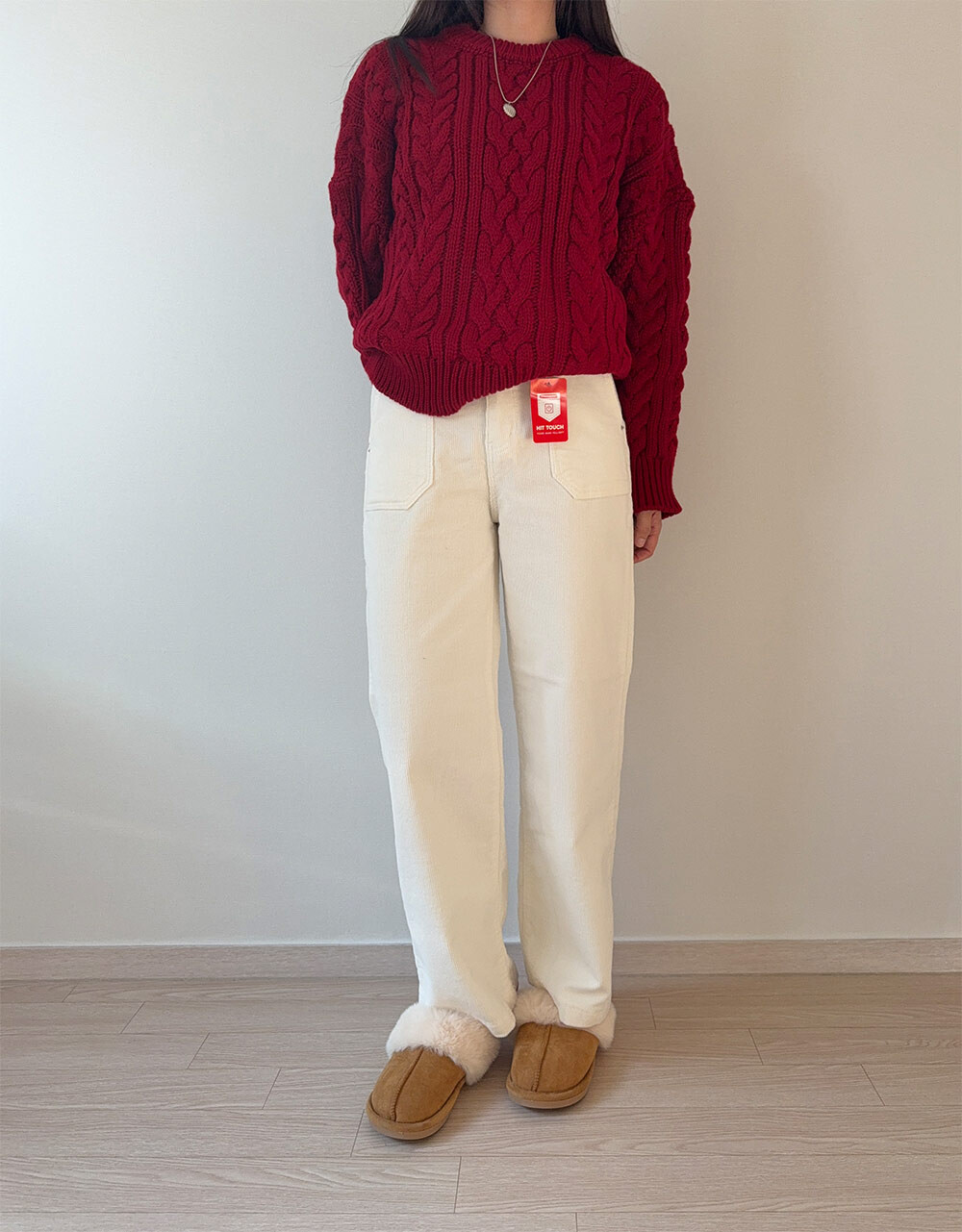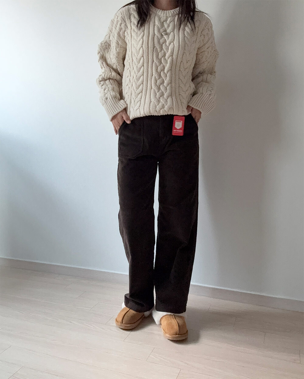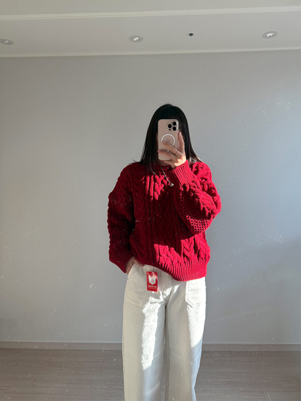 도톰한 두께감의 케이블 짜임으로 한겨울까지 따뜻하게, 데일리룩부터 홈웨어 무드까지 자연스럽게 어울리는 니트예요.