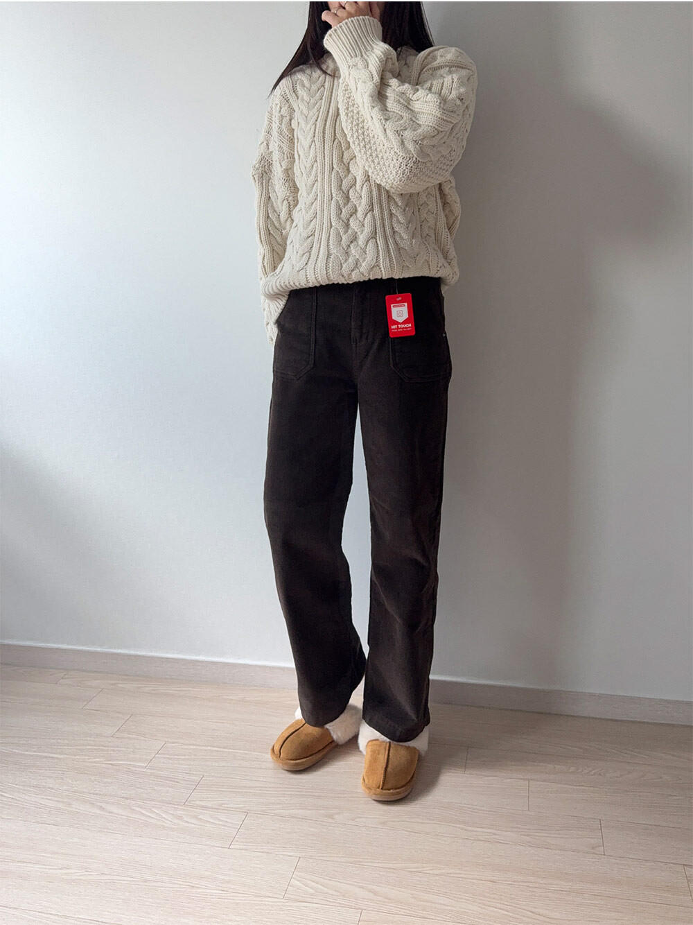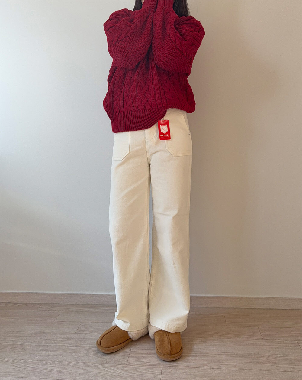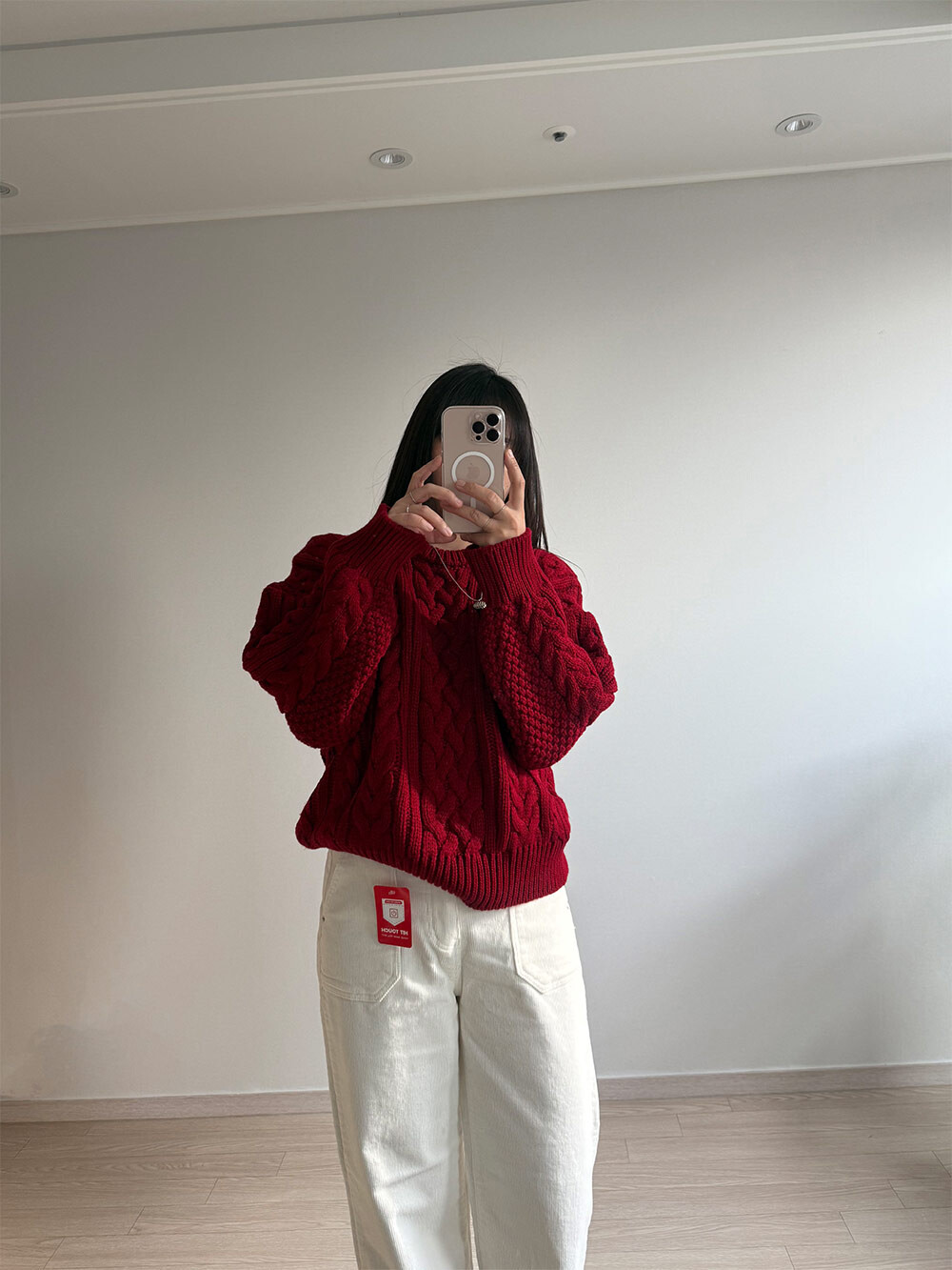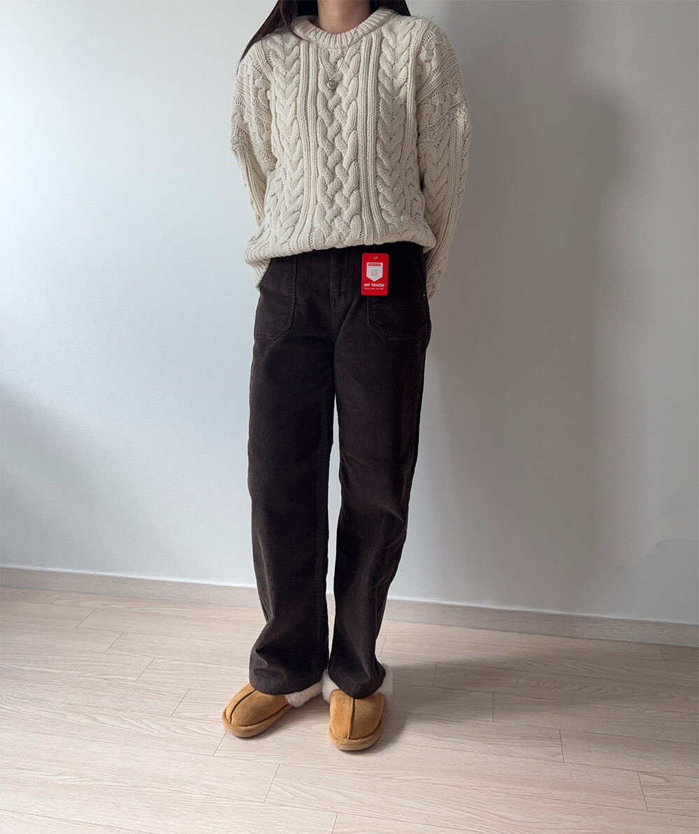 도톰한 두께감의 케이블 짜임으로 한겨울까지 따뜻하게, 데일리룩부터 홈웨어 무드까지 자연스럽게 어울리는 니트예요.