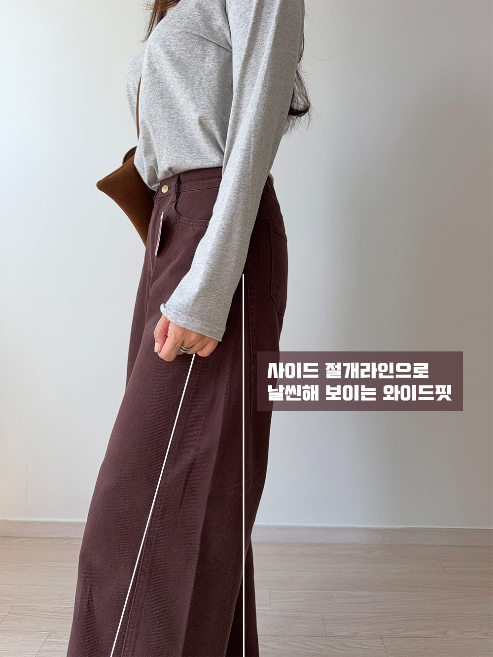 사이드 절개 라인으로 와이드핏에 더해진 삼각 플래어로 퍼지는 라인감이 체형완전 보정
