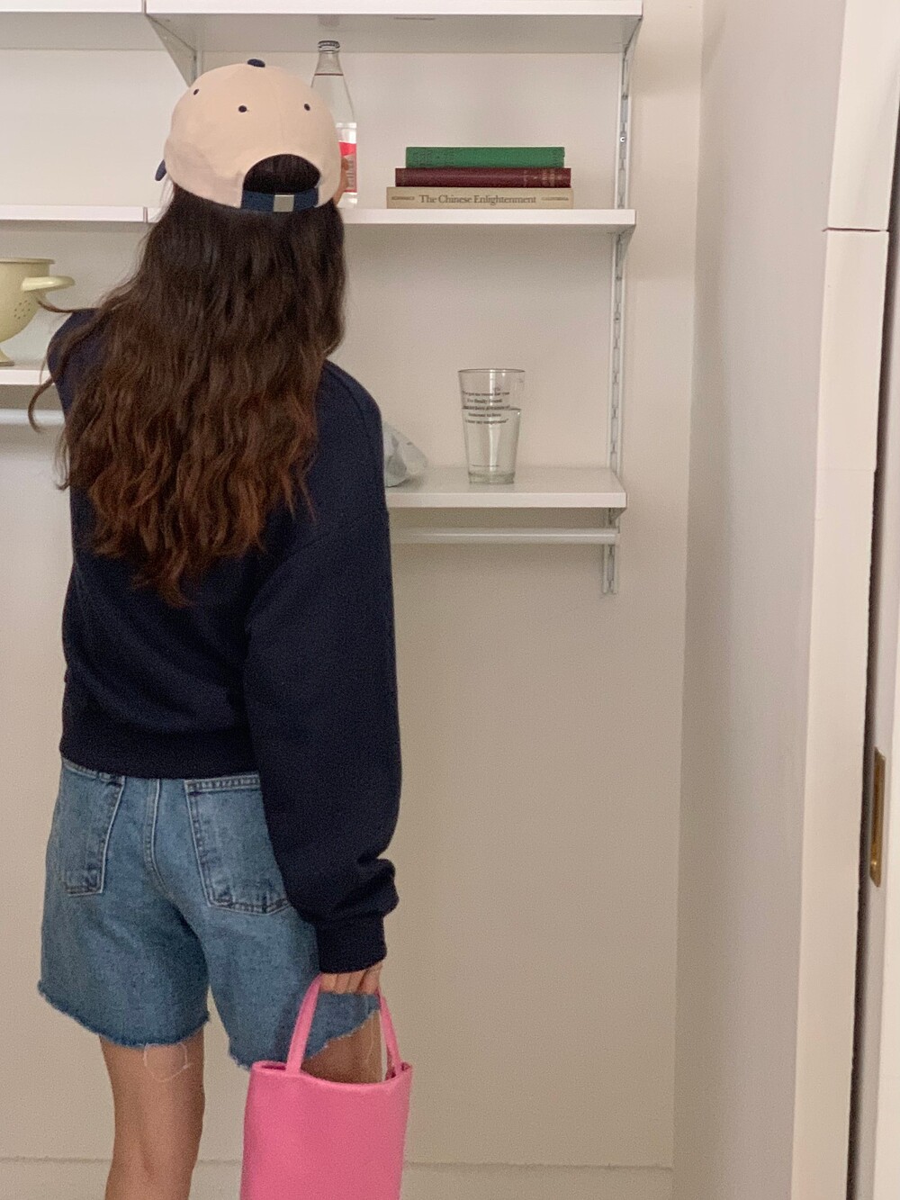 길지 않은 길이감. 살짝 크롭이지만 부담스럽지 않고 딱 하의 위에 입기 좋은 그런 길이감이라 활용도가 너무 좋아요